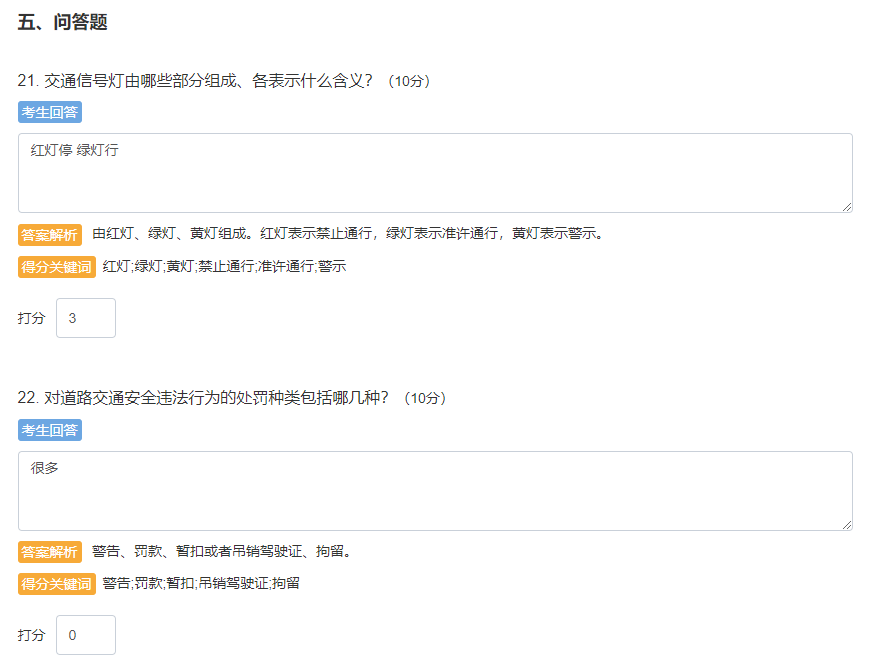 在填空题、问答题经过智能批改完成后,管理员可进入管理后台根据实际情况修改评分。