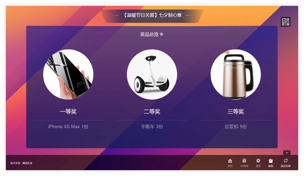 终于到了晚宴的抽奖环节!大屏幕将会展示全部奖品,点击某个奖项,可进入抽奖页面。 可以设置不重复中奖 ,已中奖的员工不会再次中奖。