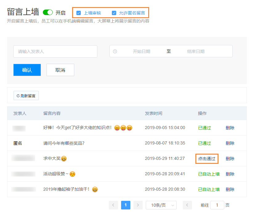 勾选 【上墙审核】 后,留言内容需管理员审核后才能上墙,管理员可在留言列表上选择 【点击通过】 ,通过后,留言将显示在活动大屏幕上。